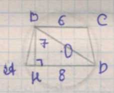 1. Рассмотрим равнобокую трапецию с основаниями \(8\) см и \(6\) см и высотой \(7\) см. Так как трапеция равнобокая, её боковые стороны равны, а проекции этих боковых сторон на большее основание делят разность оснований поровну. Следовательно, каждый из двух равных отрезков у оснований равен \(x=\frac{8-6}{2}=1\) см. Тогда в каждом из прямоугольных треугольников, образованных высотой и этим отрезком, катеты равны \(1\) и \(7\), поэтому длина боковой стороны равна гипотенузе: \(a=\sqrt{1^{2}+7^{2}}=\sqrt{50}=5\sqrt{2}\) см. Этот шаг важен: мы установили реальную геометрию трапеции, чтобы далее корректно использовать диагональ и радиус описанной окружности.