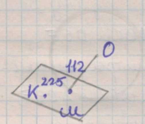 1) Пусть \(O\) — центр сферы радиуса \(R=112\) см, а \(M\) — точка касания плоскости \(\pi\) со сферой. Так как \(\pi\) касается сферы в точке \(M\), то радиус \(OM\) перпендикулярен плоскости \(\pi\), следовательно, \(OM \perp \pi\) и \(OM=R\). На плоскости \(\pi\) отмечена точка \(K\). Обозначим через \(d=MK\) искомое расстояние от точки касания до точки \(K\), а через \(a=OK\) — расстояние от центра сферы до точки \(K\). Тогда треугольник \(OMK\) прямоугольный, поскольку \(OM \perp \pi\) и \(K \in \pi\). В таком треугольнике \(OK\) является гипотенузой, а \(OM\) и \(MK\) — катетами, то есть выполняется соотношение \(OK^{2}=OM^{2}+MK^{2}\). Таким образом, мы имеем основную для задачи связь \(a^{2}=R^{2}+d^{2}\), где все величины — неотрицательные длины. Эта геометрическая конструкция фиксирует взаимное расположение точки \(K\) и центра \(O\) через перпендикуляр от \(O\) к касательной плоскости \(\pi\).