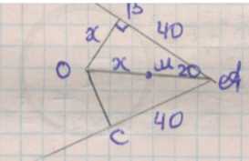 Воспользуемся прямоугольным треугольником \(AOT\). По теореме Пифагора имеем \(AO^{2}=AT^{2}+OT^{2}\), то есть \(AO^{2}=AT^{2}+R^{2}\). Подставляя \(AT=40\) и \(AO=R+20\), получаем уравнение \((R+20)^{2}=40^{2}+R^{2}\). Раскрывая скобки, имеем \(R^{2}+40R+20^{2}=40^{2}+R^{2}\), откуда \(40R=40^{2}-20^{2}\). Вычисляя, получаем \(40R=1600-400=1200\), следовательно \(R=30\). Тогда \(AO=R+20=30+20=50\). Эти значения согласуются и с исходным \(AT=40\), поскольку \(AO^{2}-R^{2}=50^{2}-30^{2}=2500-900=1600=40^{2}\), что подтверждает прямоугольность \(AOT\) при \(T\).