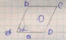 3. Для нахождения расстояния \(d\) от центра сферы до плоскости ромба используем факт касания и прямоугольную геометрию. Проведём перпендикуляр из центра сферы к плоскости ромба; его длина равна \(d\). Рассмотрим также радиус сферы, проведённый к точке касания с плоскостью ромба; он перпендикулярен плоскости и равен \(R\). Если опустить из центра сферы проекцию в плоскость ромба, то получаем прямоугольный треугольник с гипотенузой \(R\), одним катетом \(d\) (перпендикуляр к плоскости) и другим катетом \(r\) (радиус вписанной окружности в плоскости). По теореме Пифагора имеем \(R^{2}=d^{2}+r^{2}\), откуда \(d=\sqrt{R^{2}-r^{2}}\). Подставим найденные ранее выражения \(R=\frac{a}{2}\) и \(r=\frac{a}{2}\sin\alpha\): \(d=\sqrt{\left(\frac{a}{2}\right)^{2}-\left(\frac{a}{2}\sin\alpha\right)^{2}}=\sqrt{\frac{a^{2}}{4}\left(1-\sin^{2}\alpha\right)}\).