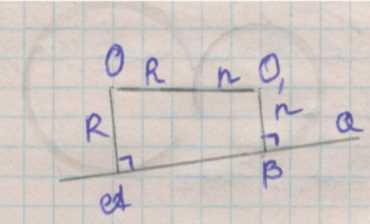 Пусть центры сфер \(O_1\) и \(O_2\) лежат по разные стороны от касательной прямой \(a\), а радиусы равны \(R\) и \(r\). Пусть \(OA\perp a\) и \(OB\perp a\), тогда \(OA=R\), \(OB=r\). Опустим перпендикуляры из \(O_1\) и \(O_2\) на \(a\); их основания лежат на одной линии, а расстояние между основаниями равно \(AB\).