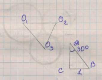 Рассмотрим три сферы, касающиеся одной плоскости в точках, которые образуют прямоугольный треугольник \(ABC\). По условию один из катетов равен \(1\) см, а угол, противолежащий этому катету, равен \(30^\circ\). Пусть катет \(AB=1\), а угол \(\angle C=30^\circ\) противолежит \(AB\). В прямоугольном треугольнике сторона, лежащая против угла \(30^\circ\), равна половине гипотенузы, поэтому гипотенуза \(AC=2\). Тогда второй катет находим по теореме Пифагора: \(BC=\sqrt{AC^{2}-AB^{2}}=\sqrt{2^{2}-1^{2}}=\sqrt{3}\). Итак, стороны треугольника, соответствующие попарным касаниям сфер над плоскостью, равны: \(AB=1\), \(BC=\sqrt{3}\), \(AC=2\).