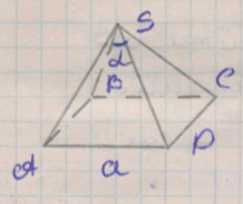 Рассмотрим правильную четырёхугольную пирамиду с вершиной \(S\) и квадратом основания со стороной \(a\). В осевом сечении через вершину \(S\) и две соседние вершины основания \(A\) и \(B\) получаем равнобедренный треугольник \(SAB\) с боковыми рёбрами \(SA=SB=l\) и основанием \(AB=a\). Плоский угол при вершине пирамиды равен \(\alpha\), то есть это угол между рёбрами \(SA\) и \(SB\) в треугольнике \(SAB\). В таком треугольнике сторона, противолежащая углу \(\alpha\), выражается через боковую сторону как хорда: \(AB=2l\sin\left(\frac{\alpha}{2}\right)\). Так как \(AB=a\), получаем ключевую связь \(a=2l\sin\left(\frac{\alpha}{2}\right)\), откуда следует \(l=\frac{a}{2\sin\left(\frac{\alpha}{2}\right)}\). Эта формула позволяет исключить \(l\) и свести все дальнейшие вычисления к параметрам \(a\) и \(\alpha\), что удобно для итоговой подстановки.