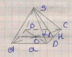 В правильной четырёхугольной пирамиде \(SABCD\) с центром основания \(O\) и стороной квадрата \(a\) рассмотрим сечение плоскостью \(SOD\), где \(D\) — середина стороны основания. В этом треугольнике \(OD=\frac{a}{2}\), а двугранный угол между гранью и основанием равен \(\alpha\). Тогда из отношения наклона грани получаем \( \tan\alpha=\frac{SO}{OD}\), откуда высота пирамиды \(SO=\frac{a}{2}\tan\alpha\).