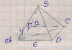 Высота пирамиды \(SB\) перпендикулярна основанию, её найдём из прямоугольного треугольника с гипотенузой \(R\) и катетом \(AO\): \(SB = \sqrt{R^2 — AO^2} = \sqrt{16 — 13} = \sqrt{3} = 2\sqrt{3}\) см.