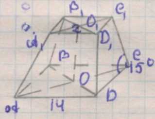 Дано, что основания усечённой правильной четырёхугольной пирамиды — квадраты со сторонами 2 см и 14 см. Сначала найдём радиусы вписанных окружностей в эти квадраты, так как они понадобятся для вычисления расстояний в пирамиде. Радиус вписанной окружности правильного квадрата равен половине его стороны, умноженной на корень из двух, то есть \(r = \frac{a \sqrt{2}}{2}\). Для меньшего основания с длиной стороны 2 см радиус будет равен \(r_1 = \frac{2 \sqrt{2}}{2} = \sqrt{2}\) см. Для большего основания со стороной 14 см радиус \(r_2 = \frac{14 \sqrt{2}}{2} = 7 \sqrt{2}\) см.