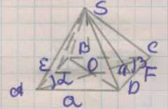 1. Для нахождения радиуса вписанной сферы пирамиды рассмотрим треугольник \( \triangle SEF \), в который вписана окружность с радиусом \( R \). Радиус вписанной сферы равен радиусу этой окружности. Основание пирамиды — ромб со стороной \( a \) и углом \( \alpha \). Рёбра пирамиды образуют с основанием двугранные углы \( \beta \). Сначала найдём длины сторон треугольника \( SEF \). Отрезки \( SE \) и \( SF \) равны между собой, так как \( S \) — вершина пирамиды, а \( E \) и \( F \) — точки основания. По условию \( SE = SF = \frac{a}{2 \cos \alpha} \), так как они получены из разбиения ромба и учитывают угол \( \alpha \). Сторона \( EF = a \), так как это сторона ромба. Высота \( SO \), проведённая из вершины \( S \) на сторону \( EF \), равна \( \frac{a \tan \beta}{2} \), что учитывает двугранный угол \( \beta \).