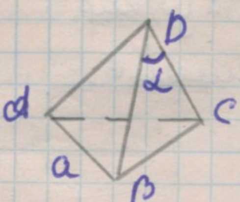 Рассмотрим правильную треугольную пирамиду с основанием стороны \(a\) и плоским углом при вершине \(\alpha\).