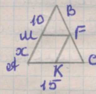 Из подобия треугольников \(AMF\) и \(ABC\) следует пропорция \( \frac{10}{10 — x} = \frac{15}{x} \).