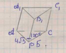 Площадь основания по формуле с углом: \(S=\frac{1}{2}\cdot 4\sqrt{3}\cdot 5\cdot \sin 120^\circ=\frac{1}{2}\cdot 4\sqrt{3}\cdot 5\cdot \frac{\sqrt{3}}{2}=15\ \text{см}^2\).
