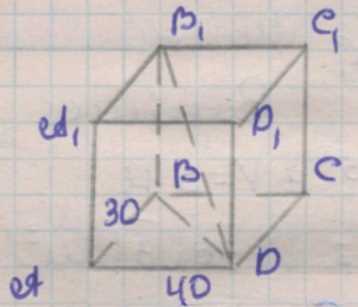 Диагональ основания: \(d=\sqrt{30^2+40^2}=50\ \text{см}\). При угле \(30^\circ\) между плоскостью, параллельной пространственной диагонали, и основанием имеем \(\tan 30^\circ=\frac{h}{d}\), следовательно \(h=50\cdot\frac{\sqrt{3}}{3}=\frac{50\sqrt{3}}{3}\ \text{см}\).
