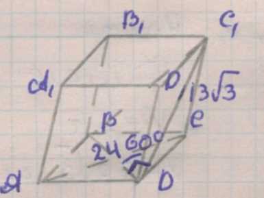 Площадь основания: \(S=\frac{d_1d_2}{2}=\frac{24\cdot10}{2}=120\). Объём: \(V=SH=120\cdot13\sqrt{3}=1560\sqrt{3}\ \text{см}^3\).