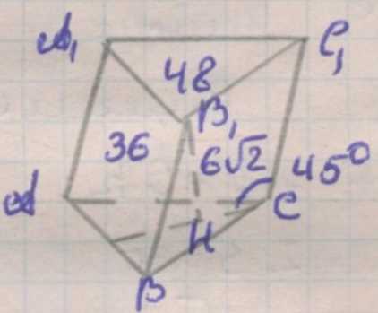 Исходные данные: высота призмы \(h=6\sqrt{2}\), боковое ребро наклонено к основанию под углом \(45^\circ\), площади двух боковых граней, прилежащих к ребру \(AA_1\), равны \(36\) и \(48\). При наклоне бокового ребра на угол \(45^\circ\) к основанию горизонтальная проекция этого ребра на плоскость основания равна \(h\cot 45^\circ=6\sqrt{2}\). Рассмотрим боковые грани \(AA_1B_1B\) и \(AA_1C_1C\). Их площади выражаются как произведение длины образующей грани (длины ребра \(AA_1=h\)) на длину соответствующей стороны основания, так как каждая такая грань является параллелограммом с одной стороной \(h\) и другой стороной, равной стороне основания, а угол между ними учитывается в площади параллелограмма самой грани. Поэтому для этих граней имеем соотношения \(36=bh\) и \(48=ch\), где \(b=BB_1\cap\) сторона основания, соответствующая ребру \(BB_1\), а \(c\) — сторона основания, соответствующая ребру \(CC_1\). Подставляя \(h=6\sqrt{2}\), получаем \(b=\frac{36}{6\sqrt{2}}=3\sqrt{2}\) и \(c=\frac{48}{6\sqrt{2}}=4\sqrt{2}\). Таким образом, в основании получаем две стороны длиной \(3\sqrt{2}\) и \(4\sqrt{2}\), прилегающие к вершине \(A\).