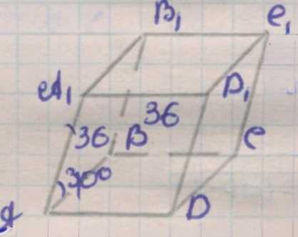 Основанием наклонной призмы является квадрат. Две боковые грани перпендикулярны плоскости основания, а площадь каждой из двух других граней равна 36 см\(^2\). Боковые рёбра призмы равны рёбрам основания и образуют с плоскостью основания угол \(30^\circ\). Найдите объём призмы.