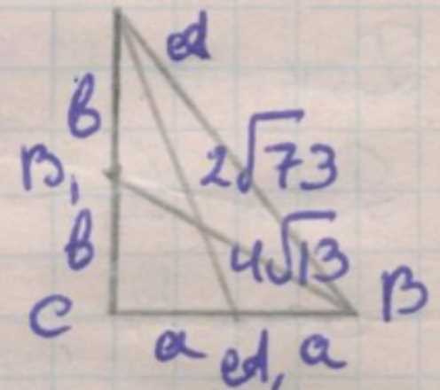 Введём катеты \(a\) и \(b\), гипотенуза \(c=\sqrt{a^2+b^2}\). Формула медианы к стороне \(x\): \(m_x=\frac{1}{2}\sqrt{2y^2+2c^2-x^2}\). По условию \(m_a=2\sqrt{73}\), \(m_b=4\sqrt{13}\), поэтому получаем систему: \(\frac{1}{4}(2b^2+2c^2-a^2)=292\), \(\frac{1}{4}(2a^2+2c^2-b^2)=208\).