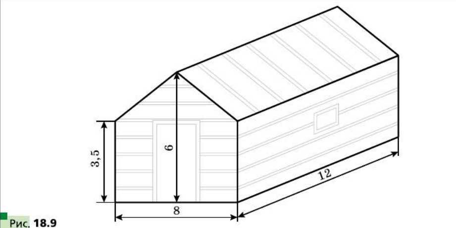 Найдите вместимость сарая с двускатной крышей (рис. 18.9), если длина сарая равна 12 м, ширина — 8 м, высота стен — 3,5 м, а высота конька крыши — 6 м (толщиной стен можно пренебречь).
