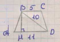 Пусть диагональ основания равнобокой трапеции равна 10, основания 11 и 5. Тогда полусумма оснований \(m=\frac{11+5}{2}=8\), а высота трапеции из формулы диагонали \(10^2=8^2+h_b^2\), откуда \(h_b=6\). Площадь основания \(S=\frac{11+5}{2}\cdot 6=48\).