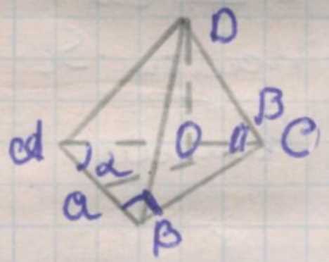 Высота пирамиды \(h\) связана с боковыми рёбрами, наклонёнными под углом \(\beta\), и равна \(h = \frac{a}{2 \cos \alpha} \tan \beta\).