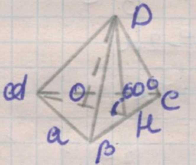 Основание пирамиды — правильный треугольник со стороной \(a\). Площадь такого треугольника вычисляется по формуле \(S = \frac{a^{2} \sqrt{3}}{4}\). Это стандартная формула для площади правильного треугольника, где \(a\) — длина стороны, а \(\sqrt{3}\) возникает из соотношений внутри равностороннего треугольника. Площадь основания нужна для расчёта объёма пирамиды, так как объём определяется через площадь основания и высоту.