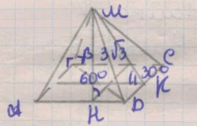 Высота пирамиды — это перпендикуляр, опущенный из вершины \(M\) на плоскость основания. Из условия высота равна \(h = 3\sqrt{3}\) см. Высота показывает, насколько высоко расположена вершина пирамиды относительно основания, и используется в формуле объёма.