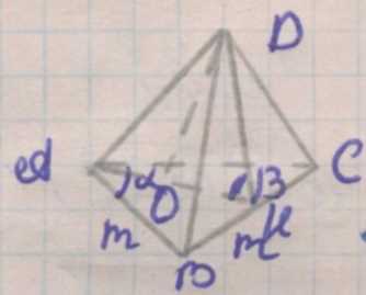 Высота \(h\) равна \(m \tan \beta\), так как грани \(DAB\) и \(DAC\) перпендикулярны основанию, а грань \(DBC\) наклонена под углом \(\beta\).