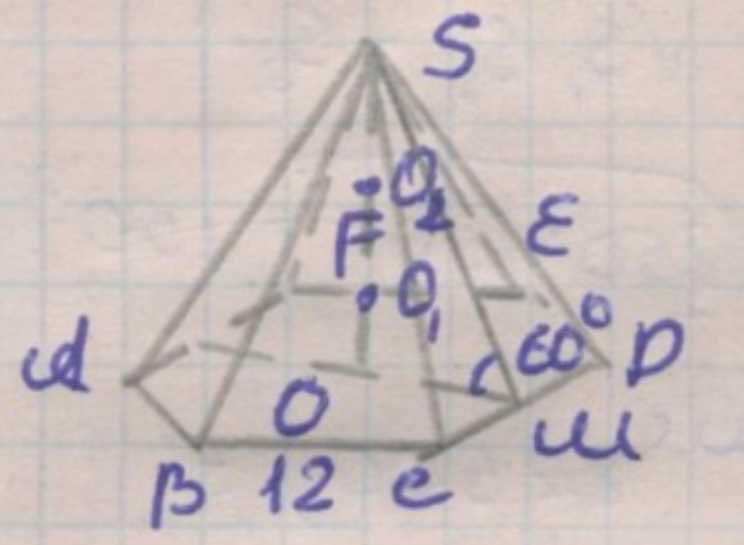 Площадь основания правильной шестиугольной пирамиды \(S = \frac{3 \sqrt{3}}{2} \times 12^{2} = 216 \sqrt{3}\).