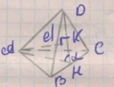 Объём пирамиды \(V\) вычисляется по формуле \(V = \frac{1}{3} S h\), где \(S\) — площадь основания, а \(h\) — высота пирамиды. В задаче основание пирамиды — равносторонний треугольник, и нам нужно выразить его сторону через заданные параметры. Для этого рассмотрим треугольник \(edk\), где угол \(\alpha\) дан, и в нём можно применить тригонометрические соотношения. По определению синуса в этом треугольнике имеем \(\sin \alpha = \frac{el}{ed}\), откуда длина ребра основания \(ed\) выражается как \(ed = \frac{el}{\sin \alpha}\).
