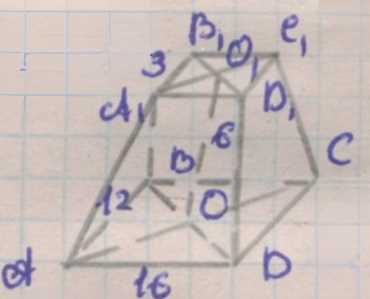 Объём усечённой пирамиды вычисляется по формуле \( V = \frac{1}{3} h (S_1 + \sqrt{S_1 S_2} + S_2) \), где \(h = 6\) см — высота, \(S_1 = 12 \times 16 = 192\) см\(^{2}\) — площадь большого основания, \(S_2 = 3 \times 4 = 12\) см\(^{2}\) — площадь малого основания.