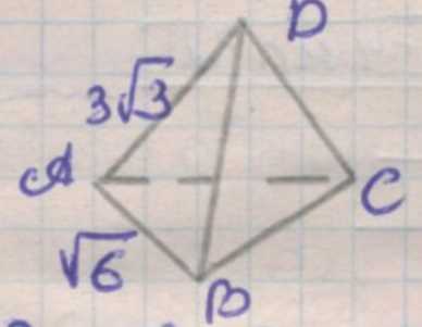 Для равностороннего треугольника радиус вписанной окружности равен \(\;r=\frac{a\sqrt{3}}{6}\), при \(a=\sqrt{6}\) имеем \(\;r=\frac{\sqrt{6}\sqrt{3}}{6}=\frac{\sqrt{18}}{6}=\frac{3\sqrt{2}}{6}=\frac{\sqrt{2}}{2}\). Радиус окружности, проходящей через вершины, равен \(\;R=\frac{a\sqrt{3}}{3}\), при \(a=\sqrt{6}\) получаем \(\;R=\frac{\sqrt{6}\sqrt{3}}{3}=\frac{\sqrt{18}}{3}=\frac{3\sqrt{2}}{3}=\sqrt{2}\). Вершина \(D\) находится на общей нормали к плоскости основания через соответствующий центр, поэтому высота \(h\) удовлетворяет теореме Пифагора для отрезка \(AD\) и поперечного радиуса: \(\;h=\sqrt{AD^{2}-\rho^{2}}\), где \(\rho\) равен либо \(r\), либо \(R\). При \(\;AD=3\sqrt{3}\) получаем две численные высоты: \(\;h_{1}=\sqrt{(3\sqrt{3})^{2}-r^{2}}=\sqrt{27-\left(\frac{\sqrt{2}}{2}\right)^{2}}=\sqrt{27-\frac{1}{2}}=\sqrt{\frac{53}{2}}\) и \(\;h_{2}=\sqrt{(3\sqrt{3})^{2}-R^{2}}=\sqrt{27-(\sqrt{2})^{2}}=\sqrt{27-2}=5\).