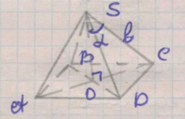Из определения косинуса угла \(\alpha\) в треугольнике \(SOC\) следует, что \(\cos \alpha = \frac{SO}{b}\), откуда высота пирамиды равна \(SO = b \cos \alpha\). Это ключевой момент, так как высота пирамиды — перпендикуляр, опущенный из вершины на основание, и именно она участвует в формуле объема. Далее, используя синус угла \(\alpha\), находим длину отрезка \(OC\), который является одним из элементов основания: \(\sin \alpha = \frac{OC}{b}\), значит \(OC = b \sin \alpha\).