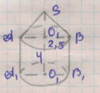 Объём стога — сумма объёмов цилиндра и конуса: \(V=V_{\text{цил}}+V_{\text{кон}}\). Радиус \(r=2{,}5\) м, высота цилиндра \(h_{\text{ц}}=2{,}2\) м, высота конуса \(h_{\text{к}}=4-2{,}2=1{,}8\) м.