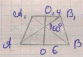 Дано: радиусы оснований \(R_1=6\) см и \(R_2=4\) см. В осевом сечении диагонали пересекаются под углом \(60^\circ\). Пусть высота усечённого конуса \(h\). В осевом сечении получаем равнобедренную трапецию с полурасностью оснований \(a=R_1-R_2=2\) и углом между диагоналями \(\varphi=60^\circ\). Тогда \(\tan\frac{\varphi}{2}=\frac{a}{h}\Rightarrow \tan 30^\circ=\frac{2}{h}\Rightarrow h=\frac{2}{\tan 30^\circ}=\frac{2}{\frac{1}{\sqrt{3}}}=2\sqrt{3}\).