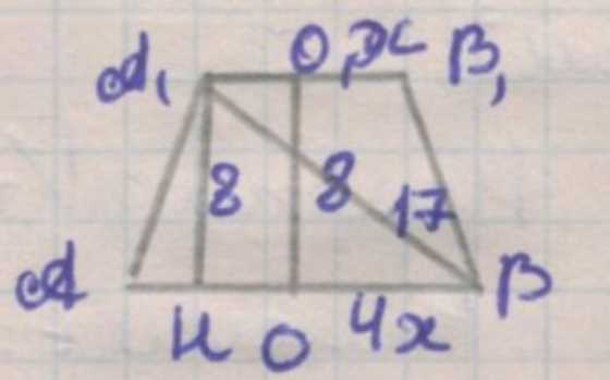 Дано: \(R=4r\), \(h=8\), диагональ осевого сечения \(d=17\). По теореме Пифагора для прямоугольного треугольника осевого сечения: \(d^2=h^2+(R-r)^2\). Тогда \(17^2=8^2+(4r-r)^2\Rightarrow 289=64+9r^2\Rightarrow r^2=25\Rightarrow r=5,\ R=20\).