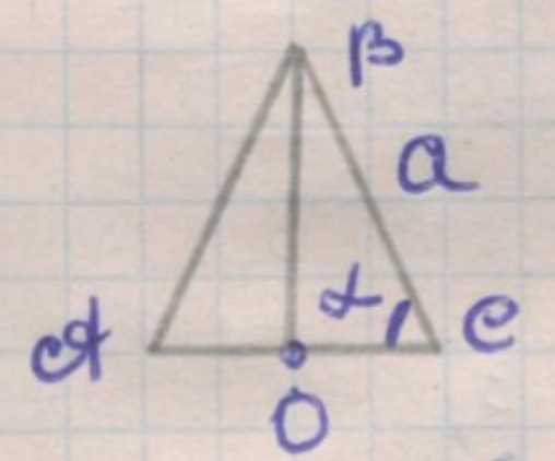 Пусть образующая конуса равна \(a\), а угол между образующей и плоскостью основания равен \(\alpha\). Тогда в прямом круговом конусе образующая, радиус основания и высота образуют прямоугольный треугольник, где угол при основании равен \(\alpha\). Отсюда радиус основания \(R\) и высота \(h\) выражаются через \(a\) и \(\alpha\): \(R=a\sin\alpha\), \(h=a\cos\alpha\). Осевая высота конуса равна \(h\), а длина образующей, соединяющей вершину с точкой круга основания, равна \(a\), что согласуется с исходными данными.