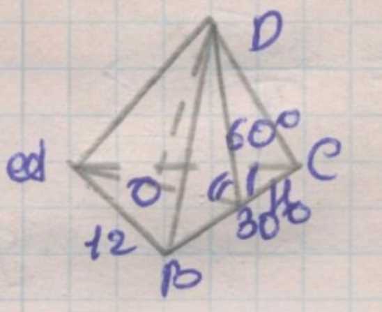 В основании пирамиды сторона, напротив угла \(60^\circ\), равна \(12\). Для равнобедренного треугольника с таким углом его описанная окружность даёт \(R=\frac{12}{\sqrt{3}}=4\sqrt{3}\).