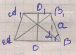Дано: образующая усечённого конуса \(a\), угол между образующей и плоскостью большого основания \(\alpha\). В осевом сечении (равнобедренная трапеция) диагонали перпендикулярны.