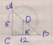 1. Рассмотрим прямоугольный треугольник с катетами 5 см и 12 см. По теореме Пифагора длина гипотенузы равна \(c=\sqrt{5^{2}+12^{2}}=\sqrt{25+144}=13\) см. Окружность с центром на гипотенузе касается большего катета (12 см) и проходит через вершину острого угла, противолежащую этому катету. Обозначим радиус окружности через \(r\), точку касания с большим катетом через \(K\), а центр окружности через \(O\).