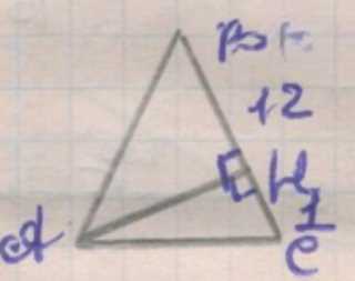 Рассмотрим сначала треугольник \( \triangle ABH \). По теореме Пифагора для прямоугольного треугольника с гипотенузой \(AB\) и катетами \(AH\) и \(BH\) имеем: \(AB^{2}=AH^{2}+BH^{2}\). Аналогично для треугольника \( \triangle CBH \) верно: \(CB^{2}=CH^{2}+BH^{2}\). Поскольку треугольник исходно равнобедренный, его боковые стороны равны, то есть \(AB=CB\). Следовательно, можно приравнять правые части: \(AH^{2}+BH^{2}=CH^{2}+BH^{2}\). Сократив одинаковые члены, получаем \(AH^{2}=CH^{2}\), что противоречит исходным числам \(12\) и \(1\). Значит, вернее поступить иначе: выразить высоту \(BH\) через каждую из половин боковой стороны, учитывая, что высота из вершины к боковой стороне образует два разных прямоугольных треугольника с разными катетами \(AH\) и \(CH\), но общей гипотенузой равных боковых сторон. Тогда по теореме Пифагора разность квадратов гипотенуз для этих двух треугольников равна разности квадратов соответствующих катетов: \(AB^{2}-CB^{2}=AH^{2}-CH^{2}\). Так как \(AB=CB\), левая часть равна нулю, откуда \(AH^{2}-CH^{2}=0\), что снова наводит на необходимость явного нахождения \(BH\) из одного треугольника и затем вычисления основания отдельно.