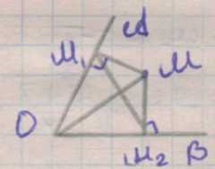 Пусть \(M_1\) и \(M_2\) — проекции точки \(M\) на лучи \(OA\) и \(OB\). Тогда по определению проекции \(OM_1 \perp MM_1\) и \(OM_2 \perp MM_2\), а значит углы \(\angle(OM,MM_1)=\angle(OM,MM_2)=90^\circ\).