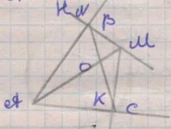 1) Рассмотрим окружность, описанную около треугольника \(ABC\), и произвольную точку \(M\) на этой окружности. Определим точки \(N\) и \(K\) как основания перпендикуляров из \(M\) на прямые \(AB\) и \(AC\) соответственно: \(MN \perp AB\), \(MK \perp AC\). Тогда отрезок \(NK\) является расстоянием между двумя проекциями одной и той же точки \(M\) на две пересекающиеся прямые \(AB\) и \(AC\). Удобно рассмотреть ортогональное проектирование на направление, перпендикулярное биссектрисе угла \(A\). Если обозначить отражение точки \(M\) относительно биссектрисы угла \(A\) через \(M’\), то вектор \( \overrightarrow{NK} \) получается как ортогональная проекция хорды \(MM’\) на прямую, перпендикулярную биссектрисе, и длина \(NK\) равна длине этой проекции хорды \(MM’\).