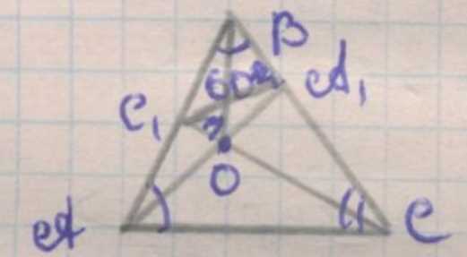 Пусть \(\angle A=2\alpha\), \(\angle C=2\gamma\), тогда из \(\angle B=60^\circ\) получаем \(\alpha+\gamma=60^\circ\). Точка \(O\) — инцентр, поэтому \(OA\), \(OB\), \(OC\) — биссектрисы, а \(C_1\) лежит на продолжении биссектрисы угла \(C\) к стороне \(AB\).