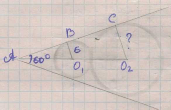 Подставим \(\alpha=60^\circ\), тогда \(\cos 60^\circ=\frac{1}{2}\). Получаем \(r_2=r_1\cdot\frac{1+\frac{1}{2}}{1-\frac{1}{2}}=r_1\cdot\frac{\frac{3}{2}}{\frac{1}{2}}=3r_1\). Таким образом, радиус большей окружности в три раза превышает радиус меньшей, что геометрически объясняется симметрией расположения центров на биссектрисе и фиксированным углом между сторонами. При \(r_1=6\) см имеем \(r_2=3\cdot 6=18\) см.