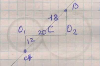 2) По условию дана длина хорд: \(AC=12\) см и \(BC=18\) см. Используя соотношения для диаметров, сразу находим радиусы: \(r_1=\frac{AC}{2}=\frac{12}{2}=6\) см и \(r_2=\frac{BC}{2}=\frac{18}{2}=9\) см. Однако нам дополнительно задано расстояние между центрами \(O_1O_2=20\) см, и при внешнем касании всегда выполняется равенство \(O_1O_2=r_1+r_2\), так как центры и точка касания лежат на одной прямой, а отрезок между центрами складывается из радиусов, направленных к точке касания: \(O_1O_2=r_1+r_2\).
