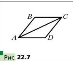На рисунке 22.7 изображён ромб ABCD, в котором \(AB = 2\) см, \(\angle ABC = 120^\circ\). Найдите скалярное произведение векторов \(\overrightarrow{AB}\) и \(\overrightarrow{AC}\).