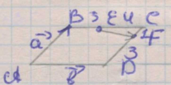 Так как \(CF:FD=1:3\), то \(F=C+\frac{1}{4}\overrightarrow{CD}=(\vec{a}+\vec{b})+\frac{1}{4}\vec{a}=\frac{5}{4}\vec{a}+\vec{b}\).
