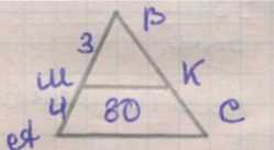 1) Так как прямая \(MK\) параллельна стороне \(AC\) треугольника \(ABC\), то по теореме о параллельных прямых в треугольнике получаем подобие треугольников \(MBK\) и \(ABC\) с одинаковой ориентацией вершин: \(M \leftrightarrow A\), \(B \leftrightarrow B\), \(K \leftrightarrow C\). Подобие следует из равенства углов: \(\angle MBK=\angle ABC\) как вертикальные углы при параллельных прямых, а также \(\angle MKB=\angle ACB\) как накрест лежащие углы при \(MK \parallel AC\). Следовательно, коэффициент подобия равен отношению соответствующих сторон, проходящих через вершину \(B\): \(k=\frac{MB}{AB}\). По условию \(MB=3\) см и \(AM=4\) см, значит \(AB=AM+MB=4+3=7\) см. Тогда \(k=\frac{3}{7}\). Для подобных треугольников площади относятся как квадраты коэффициента подобия, поэтому \(\frac{S_{MBK}}{S_{ABC}}=\left(\frac{3}{7}\right)^{2}=\frac{9}{49}\). Это означает, что меньший треугольник \(MBK\) занимает \(\frac{9}{49}\) от площади исходного \(ABC\).