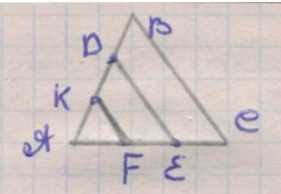1) Точки \(K\) и \(D\) делят сторону \(AB\) на три равные части: \(AK=KD=DB\). Аналогично точки \(F\) и \(E\) делят сторону \(AC\) на три равные части: \(AF=FE=EC\). Поскольку отрезки отмечены на соответствующих сторонах, то отрезки, соединяющие соответствующие точки, являются частями линий, параллельных третьей стороне треугольника \(BC\). В треугольнике при делении обеих боковых сторон на три равные части через соответствующие уровни проходят параллельные \(BC\) прямые, которые разбивают исходный треугольник на три «полосы» одинаковой высоты: нижнюю, среднюю и верхнюю. Эти полосы ограничены парами параллельных линий, а их высоты равны, так как расстояния между соседними параллелями одинаковы.