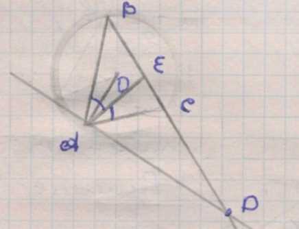 1. Угол между касательной в точке \(A\) и хордой \(AC\) равен вписанному углу, опирающемуся на ту же дугу \(AC\): \(\angle DAC=\angle ABC\). Аналогично, угол между касательной в точке \(A\) и хордой \(AB\) равен вписанному углу, опирающемуся на дугу \(AB\): \(\angle DAB=\angle ACB\). Эти равенства следуют из теоремы о касательной и секущей: угол между касательной и хордой равен вписанному углу, стоящему на соответствующей дуге. Поэтому угол при вершине \(D\) в треугольнике \(ADC\) можно выразить как сумму углов \(\angle DAB\) и \(\angle DAC\).