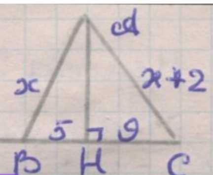 2) Подставим численные значения и выражения через \(x\): \(AB^{2}-BH^{2}=x^{2}-5^{2}\), \(AC^{2}-CH^{2}=(x+2)^{2}-9^{2}\). Приравниваем: \(x^{2}-5^{2}=(x+2)^{2}-9^{2}\). Раскроем скобки и перенесём слагаемые: \(x^{2}-25=x^{2}+4x+4-81\). Сократим \(x^{2}\) по обе стороны и соберём константы: \( -25=4x-77\). Получаем линейное уравнение \(4x=102\), откуда \(x=\frac{102}{4}=25{,}5\) см. Это длина меньшей наклонной \(AB\), а длина большей \(AC=x+2=27{,}5\) см, что согласуется с условием на разницу в \(2\) см.