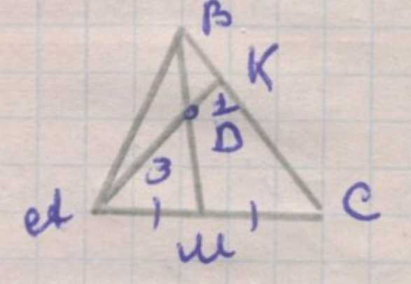 1. Пусть \(M\) — середина \(AC\), тогда \(BM\) — медиана треугольника \(ABC\). Рассмотрим произвольную точку \(K\) на стороне \(BC\) и отрезок \(AK\). Условие: медиана \(BM\) делит \(AK\) в отношении \(3:1\), считая от вершины \(A\), то есть при пересечении \(D=BM\cap AK\) выполняется \(AD:DK=3:1\). В терминах масс-точек назначим «массу» вершинам так, чтобы \(M\) был центром масс отрезка \(AC\): поскольку \(M\) — середина, то на \(A\) и \(C\) ставим равные массы. Тогда любая точка на прямой \(AK\), пересекаемая \(BM\), делится медианой в том же отношении, что точка \(K\) делит \(BC\), благодаря сохранению равновесия по лучам медианы.